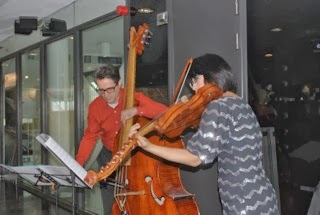 Intonation with another string instrument such as the Amore is also markedly different from playing with a piano. The piano may be constantly out of tune, but at least it is also constant in its deviation, and one quickly adapts to the specific piano out-of-tune-ness. But in our case, it’s almost the reverse: the fretted region of the bass is fixed and there is nothing much one can do, intonation-wise (when the string happens to be too flat, i can pull the notes up by sliding the string sideways, and in slow tempi i can slightly flatten a sharp note by fretting it farther behind the fret. But that’s about all the flexibility i have, and it only works in slow tempi).