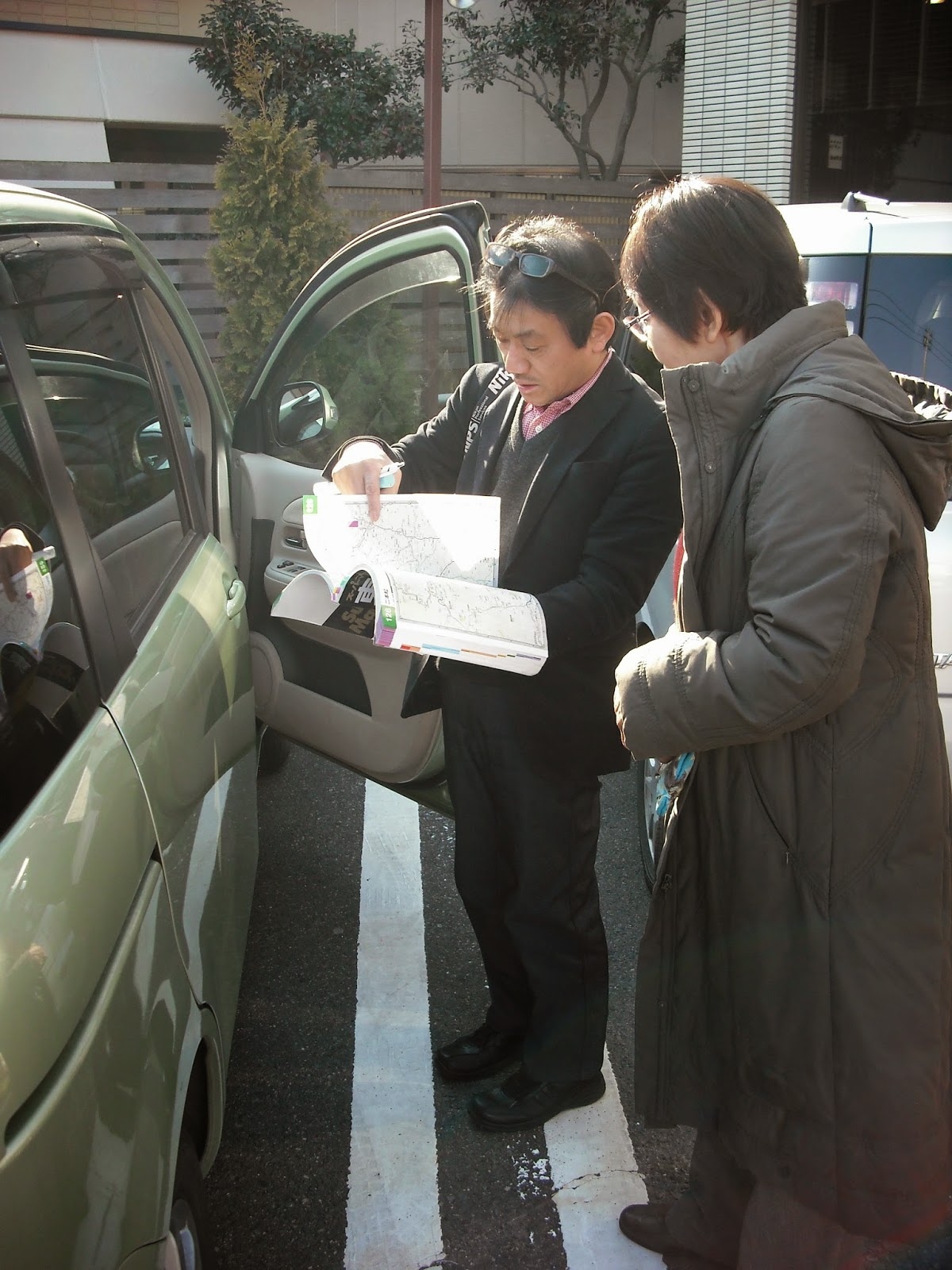 We exit the highway at Nihonmatsu. From here on we will avoid the highway and stop using the GPS,navigating instead with the roadmap in hand. Mrs. Nakahira is driving and Kikuchi will prove to be an excellent map-reader and navigator.