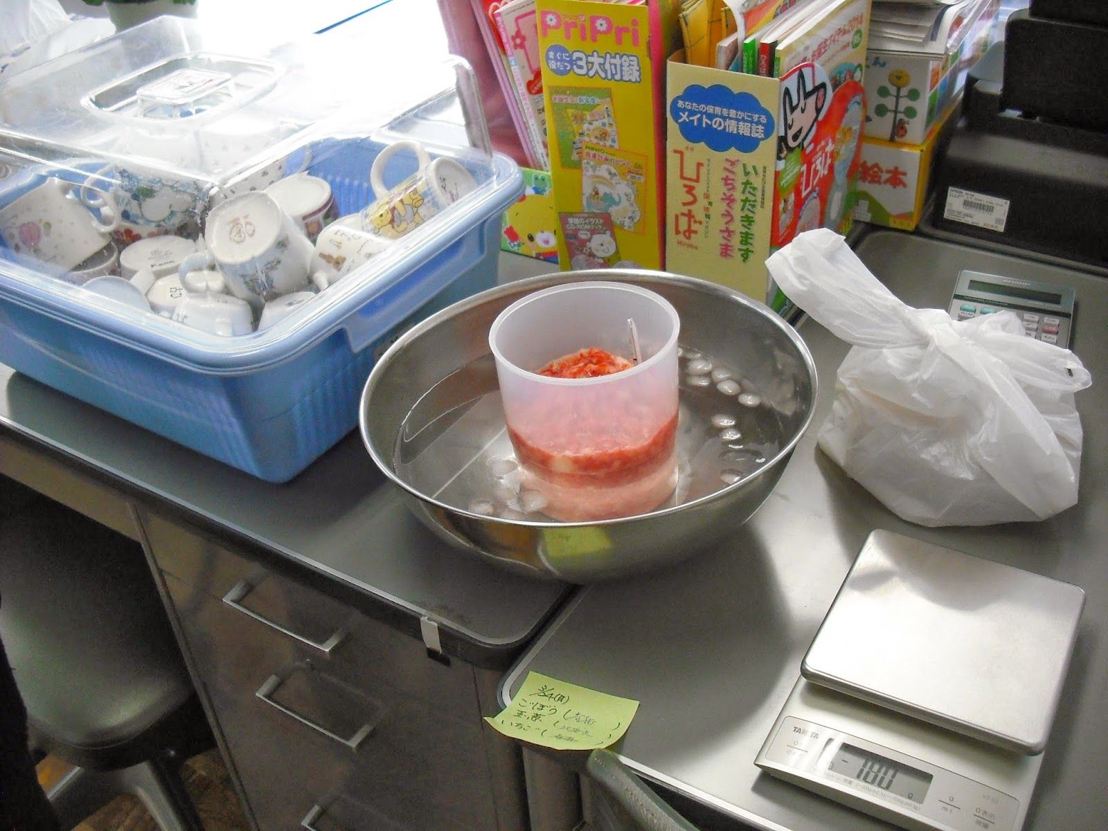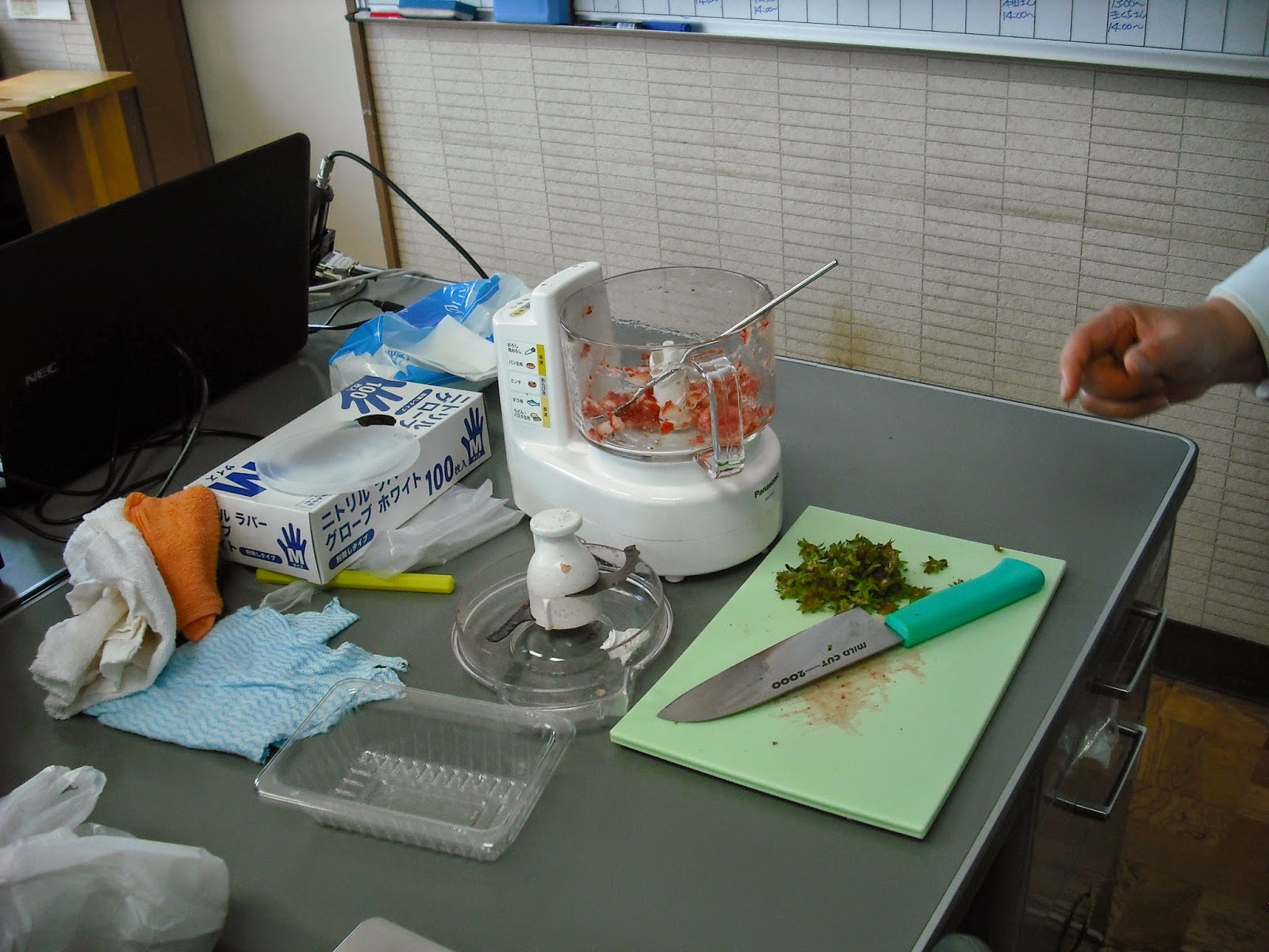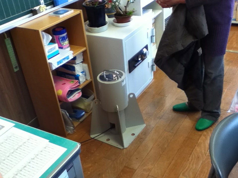 It turns out this is a measuring device, which the school uses to ensure all the children’s food is safe to eat. Kikuchi asks if he can take photos. The lady and the school director are a bit reluctant at first, as if this were something to be ashamed of, but after a moment’s reflection the director seems to have made up her mind and she says, yes of course, people should know about this, we want people to know we take the children’s health very seriously, and she goes on to explain that they can’t give Fukushima-grown food to the children because of radiation. She allows us to make photos of the machine.