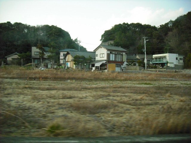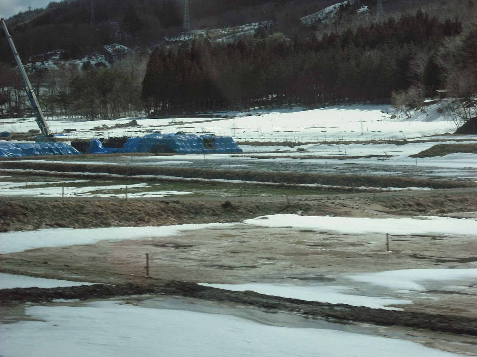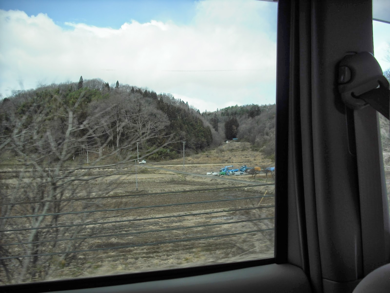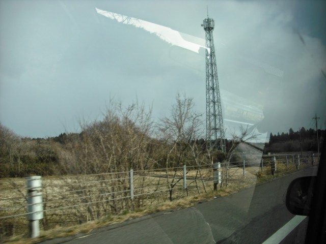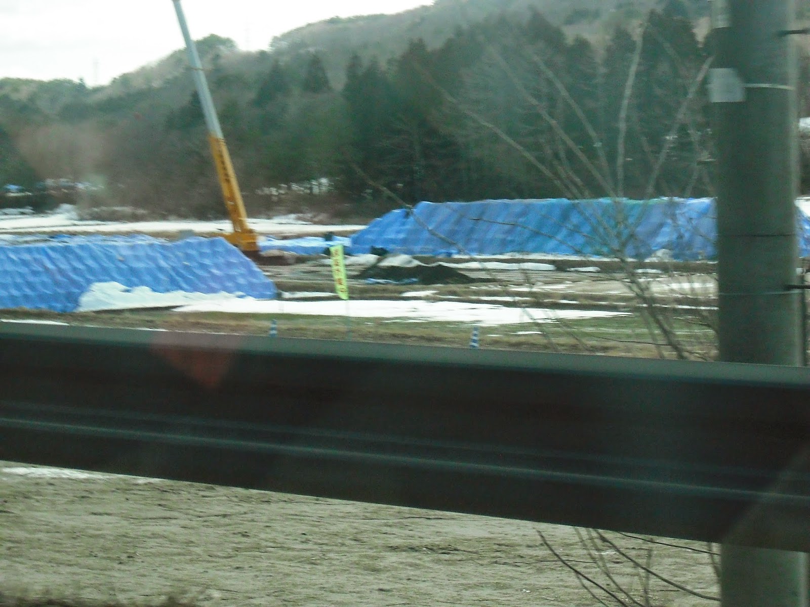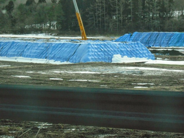 On our way again. We have some wet snow for a while, then the weather clears up again. As we approach Iwaki, on our left we see the shelter blocks where many evacuees live. They have lost their farming jobs and their homes, and there is no work for them here. They receive a government pension and housing. In some cases the combination of being unemployed and having money leads to problems of alcoholism and to tensions with local people who tend to see the newcomers as parasites. In fact, Iwaki has attracted more evacuees than any other city in Japan.