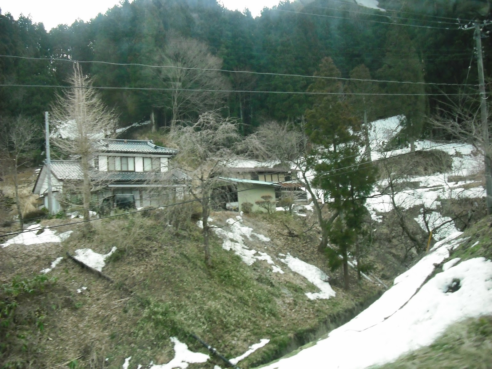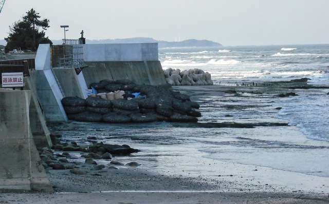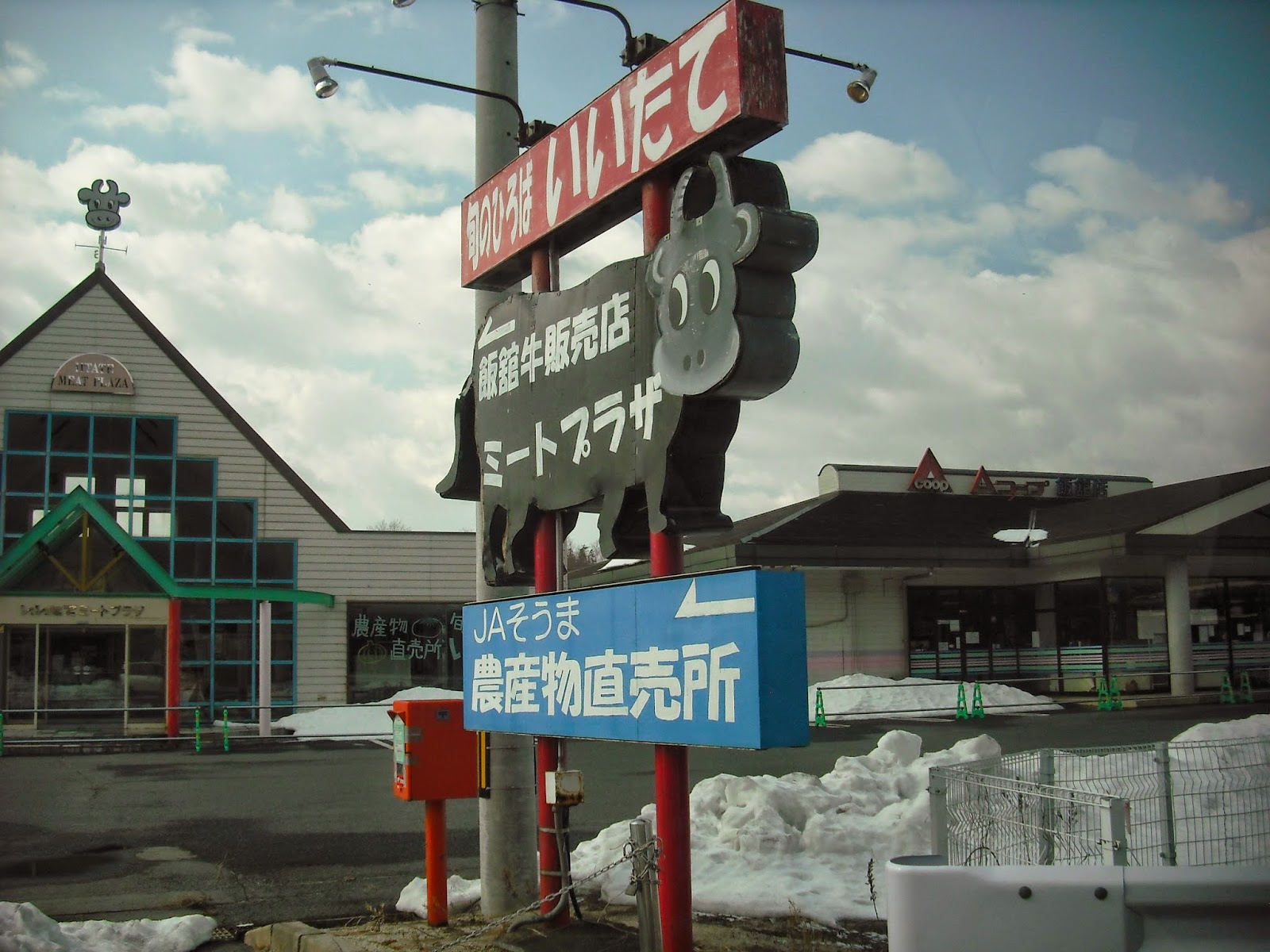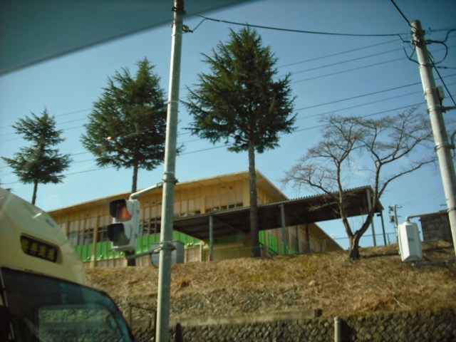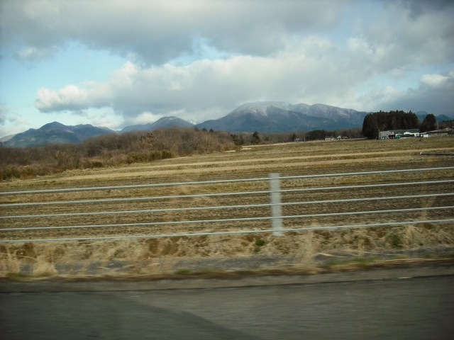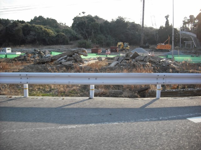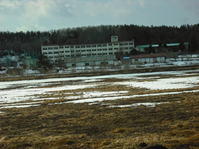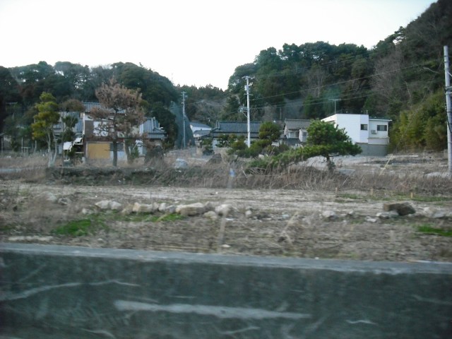 On our way again. We have some wet snow for a while, then the weather clears up again. As we approach Iwaki, on our left we see the shelter blocks where many evacuees live. They have lost their farming jobs and their homes, and there is no work for them here. They receive a government pension and housing. In some cases the combination of being unemployed and having money leads to problems of alcoholism and to tensions with local people who tend to see the newcomers as parasites. In fact, Iwaki has attracted more evacuees than any other city in Japan.