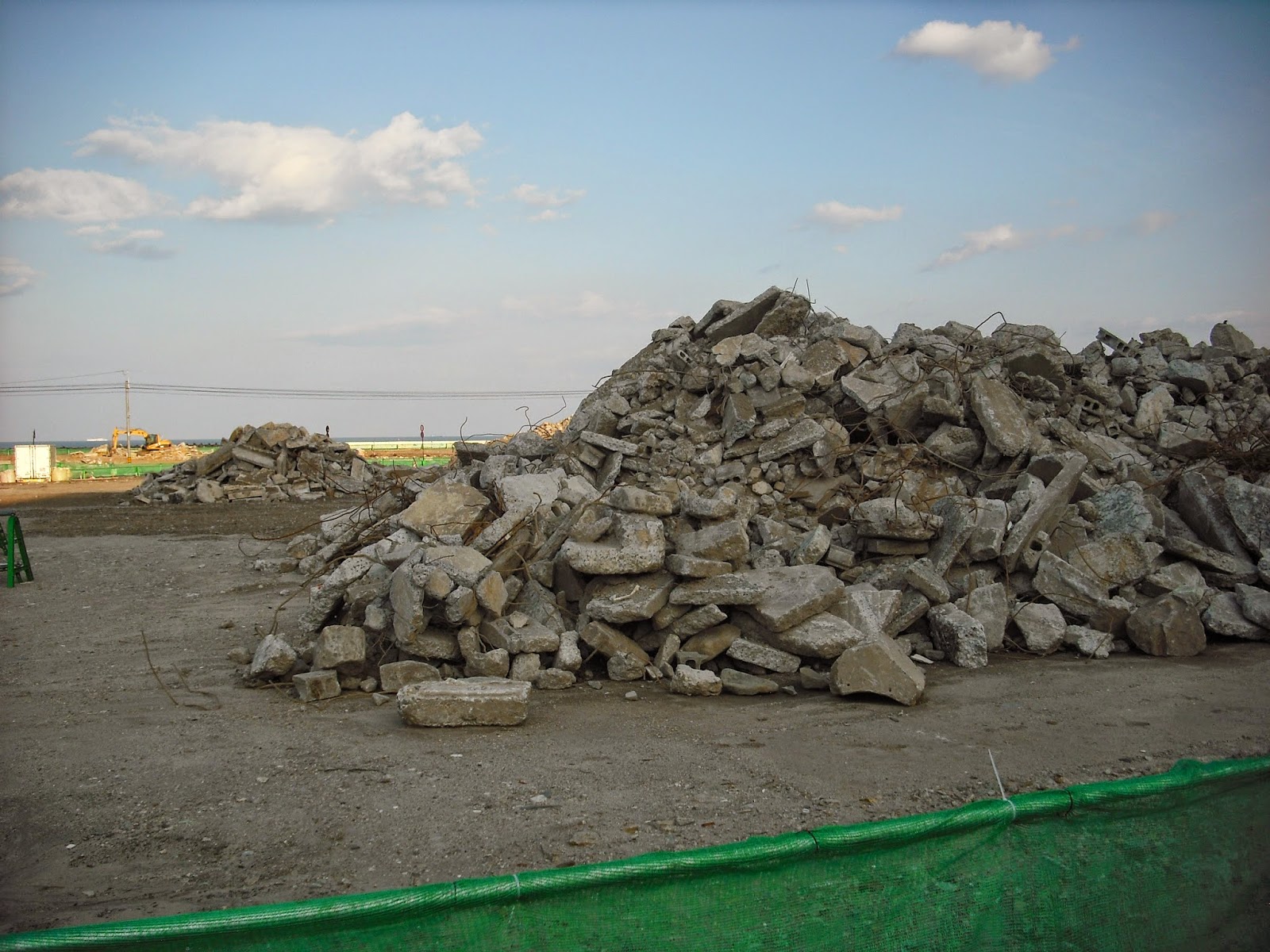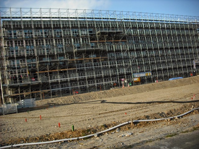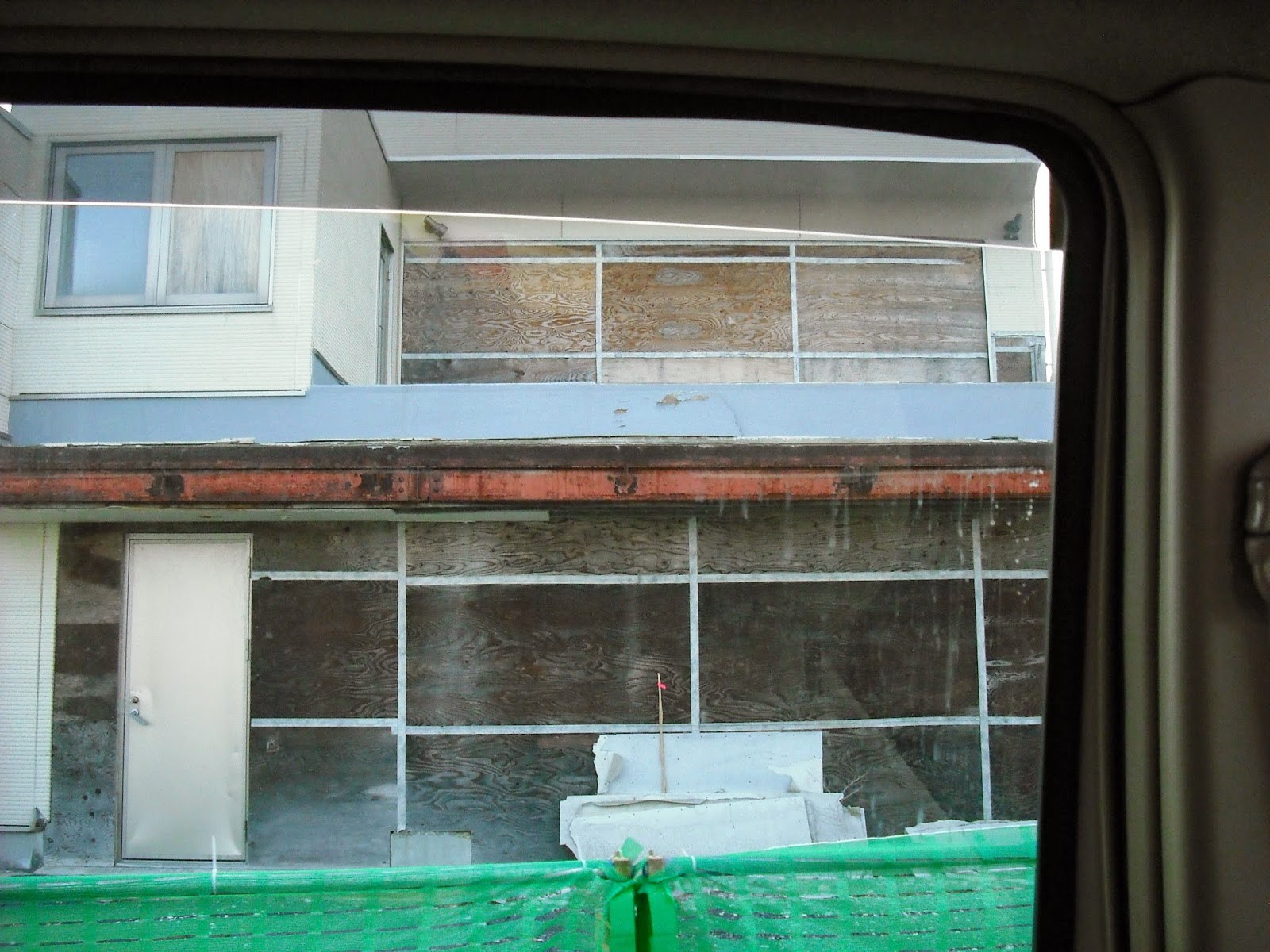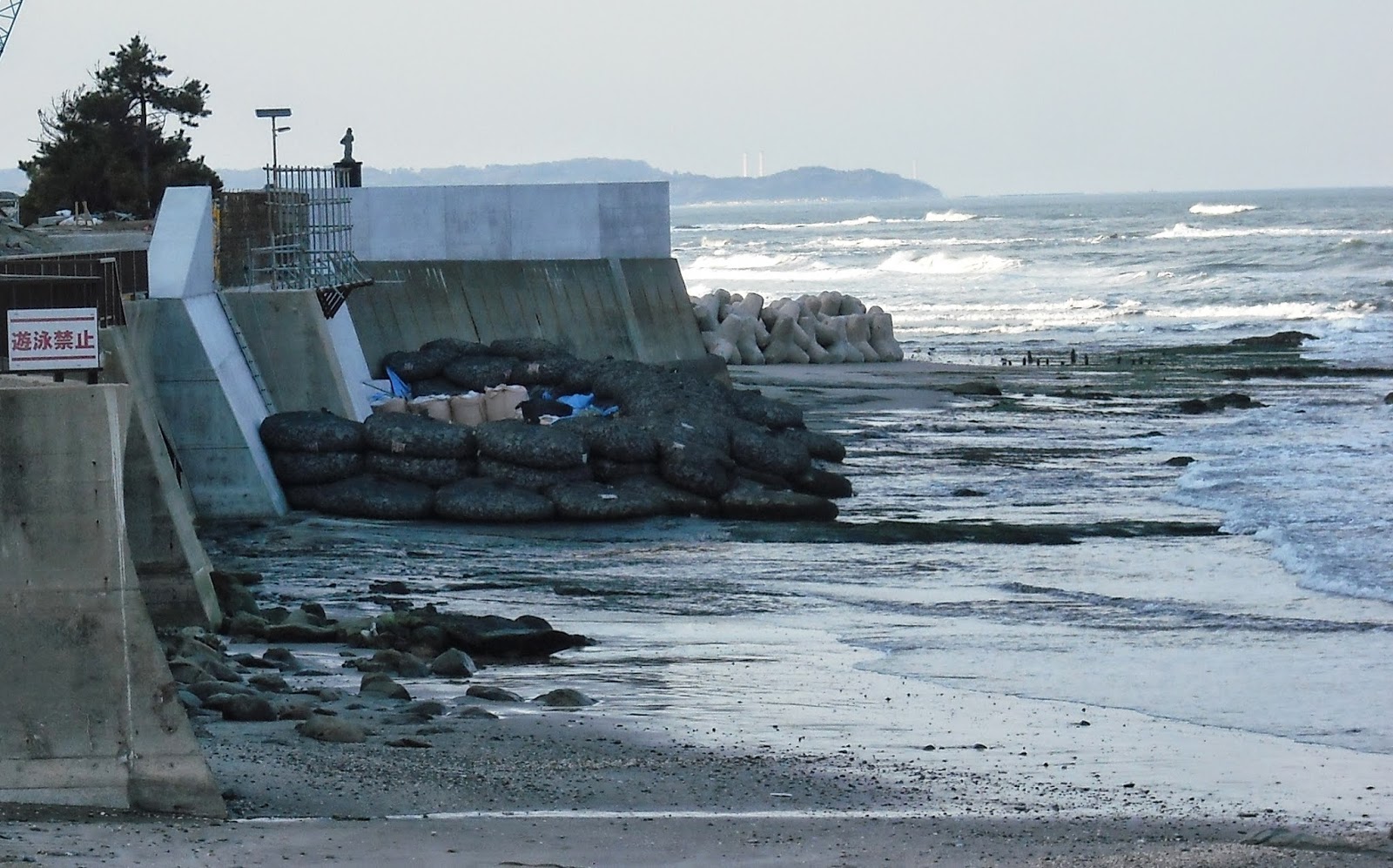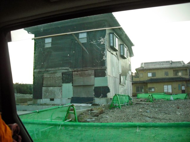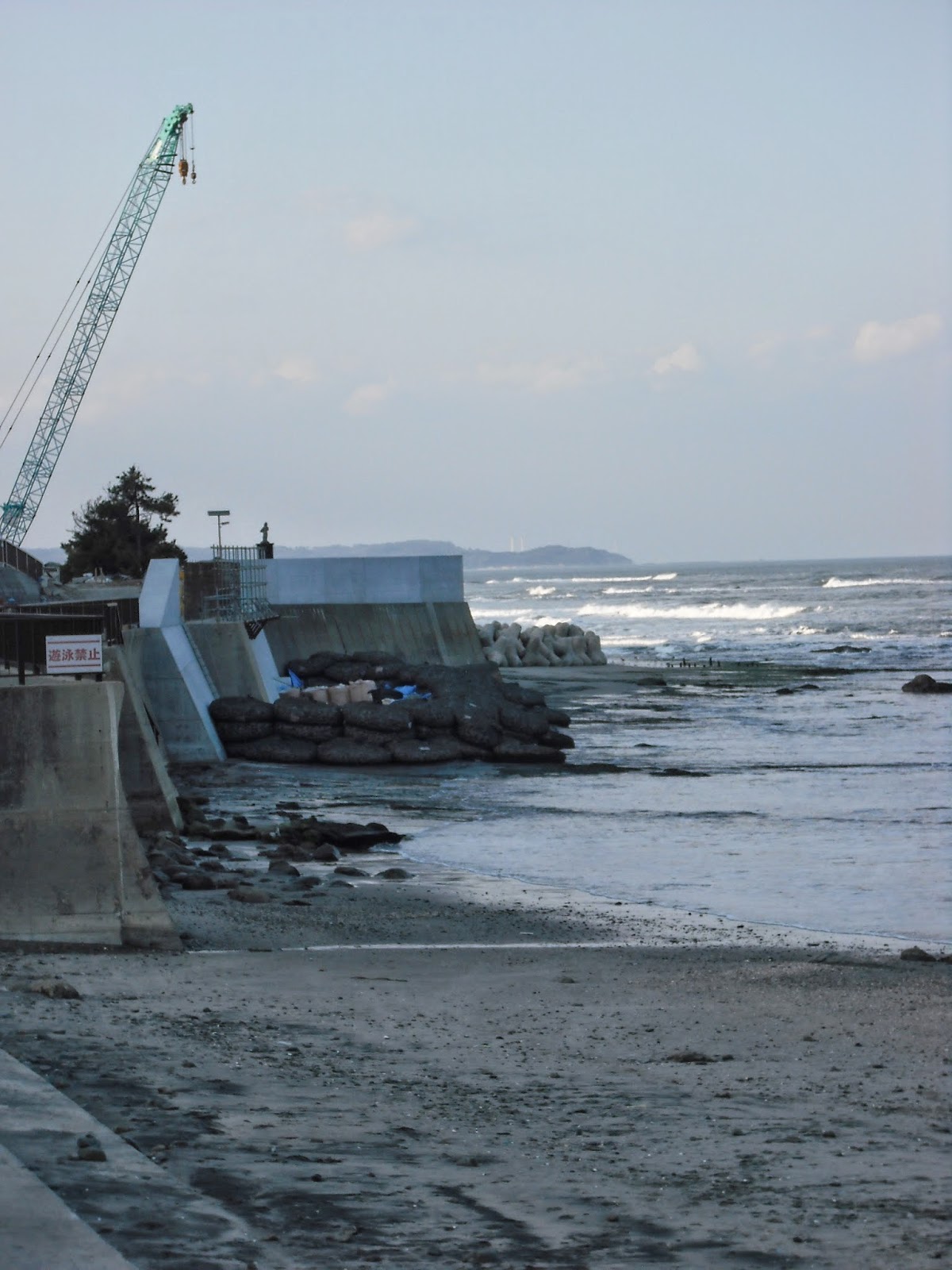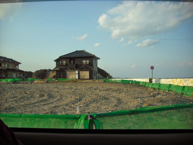 We decide to make a detour to the seaside. Kikuchi wants to see one of the few spots where we are allowed to go, and where the traces of the tsunami are still clearly visible. As we get close to the shore, we see two construction projects for new appartment buildings where evacuees can live when they return. Just a few hundred metres further, we arrive at the sea.