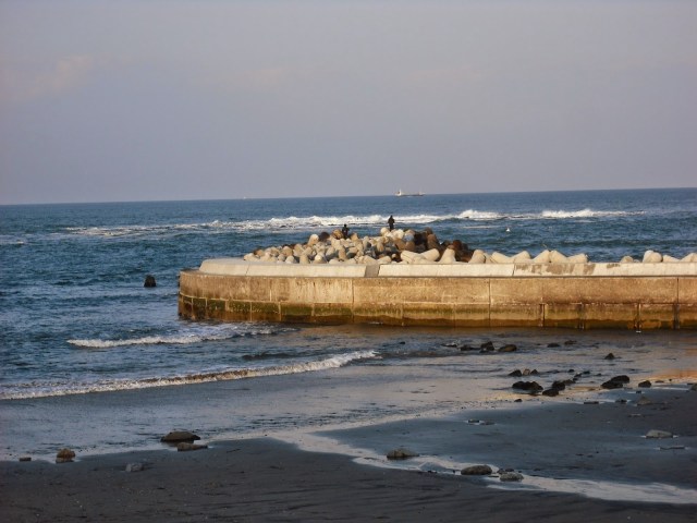 This is the sea into which tons of heavily contaminated water are being poured, day after day. The nuclear plant is scarily close: we can see its towers in the distance with the naked eye. I make sure i’m protected as well as i can with raincoat and mask, but the few other people we see don’t seem to be overly concerned. Up on a bit of land extending into the sea we even see a few people fishing. I hope they’re doing this for purposes of scientific research, to measure radiation levels in the fish. But i’m not too sure…
