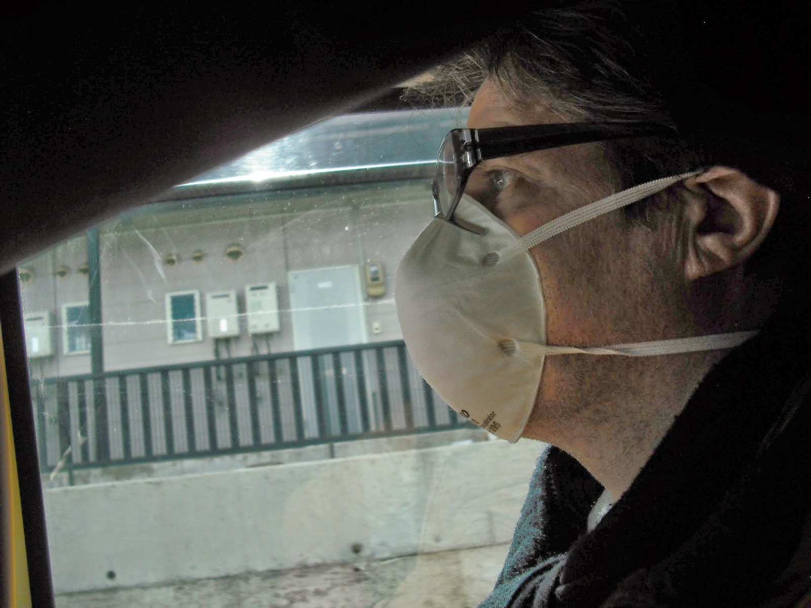 On the way we sometimes see piles of big black or blue plastic bags. They contain the radio-active scraped-off top soil layers of the surrounding land. As we move along we will see many more of these. We’re all wearing masks. Not because they will stop radiation. They won’t. But at least they will help us to avoid inhaling the radioactive dust that is blown off the land by the wind.