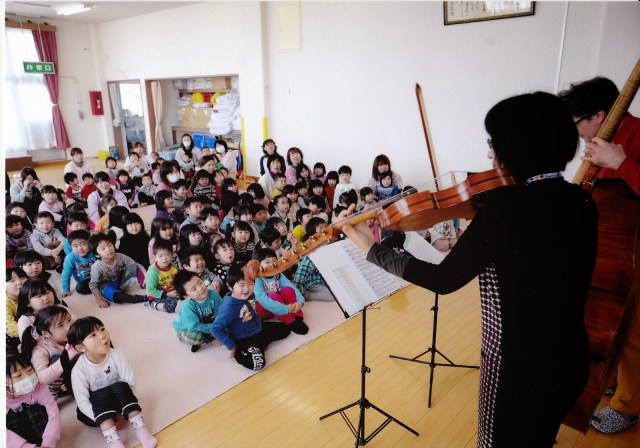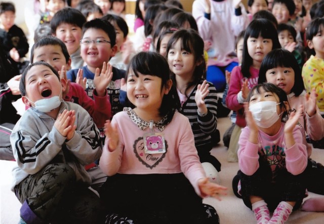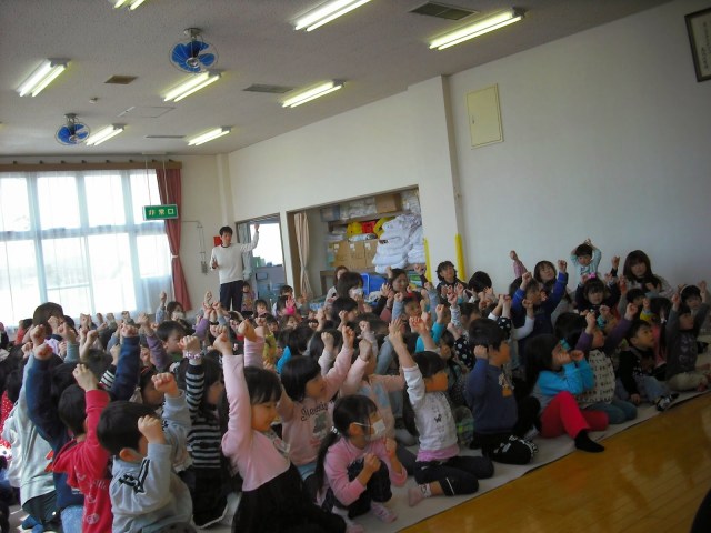 Concert time. The children are all waiting behind a curtain and we hear teacher playing piano and the children singing songs. We start playing the “potato man” song with me playing percussion on the bass as the curtain opens. We alternate the music with two Kamishibai stories, and after the concert it’s time for photos, thank you’s and the distribution of the toys we brought. We’re invited upstairs again for cold tea. In the office we spot the same machine for measuring radioactivity that we saw in the previous school.