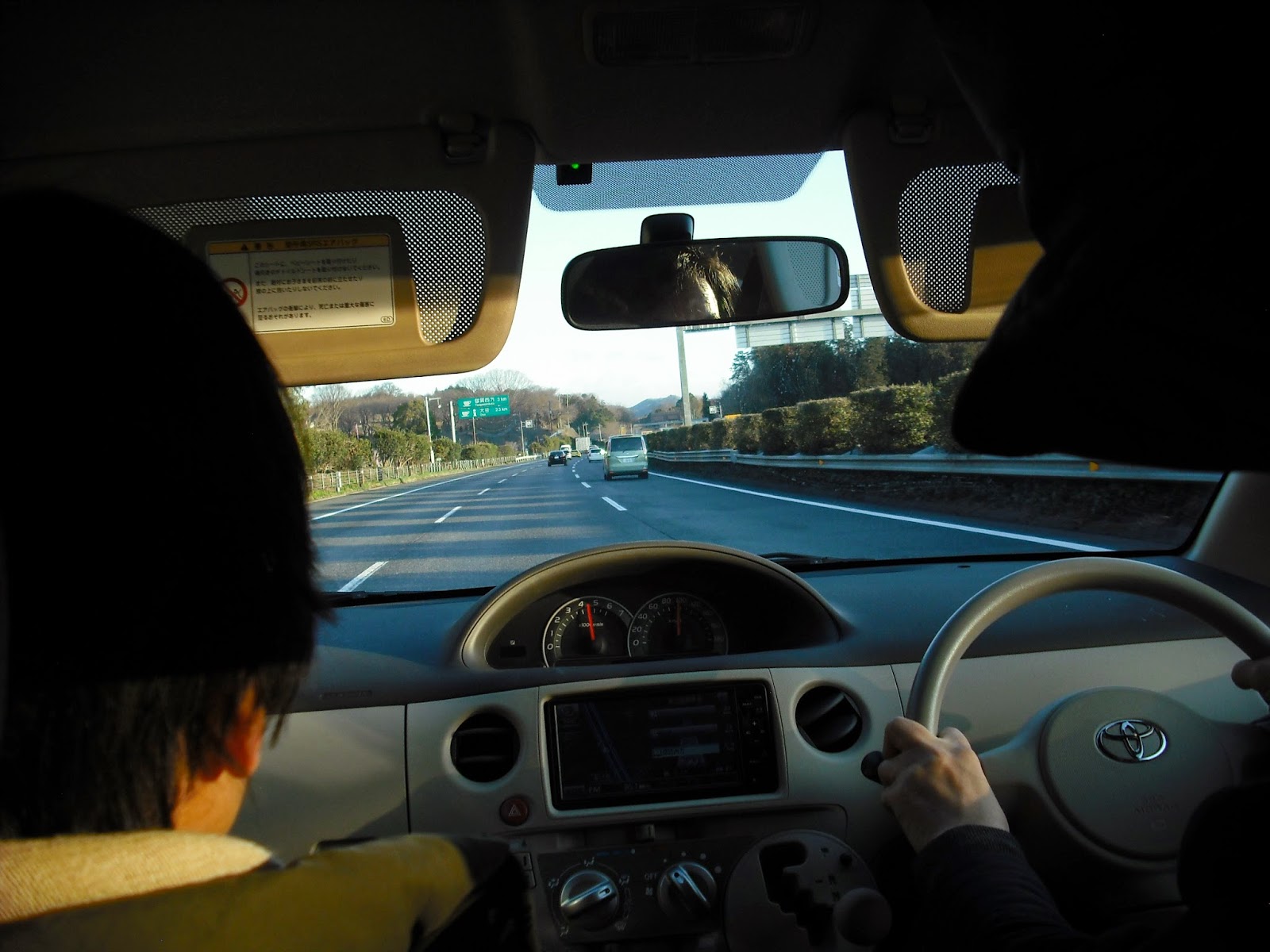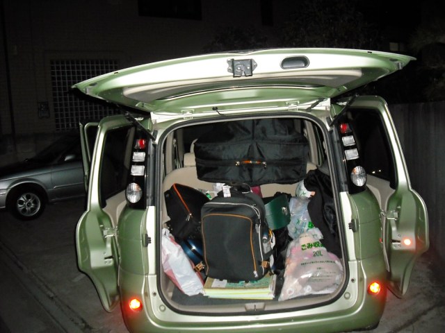 Since there’s no traffic, the taxi ride takes no more than ten minutes so we’re really too early to push Mrs. Nakahira’s bell, but we see an appartment entrance hall nearby where we find shelter from the cold. When Kikuchi-san arrives, we start loading the car with all of our bags and instruments. The bass goes across the back seats. It’s still dark as we set off.