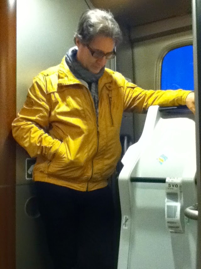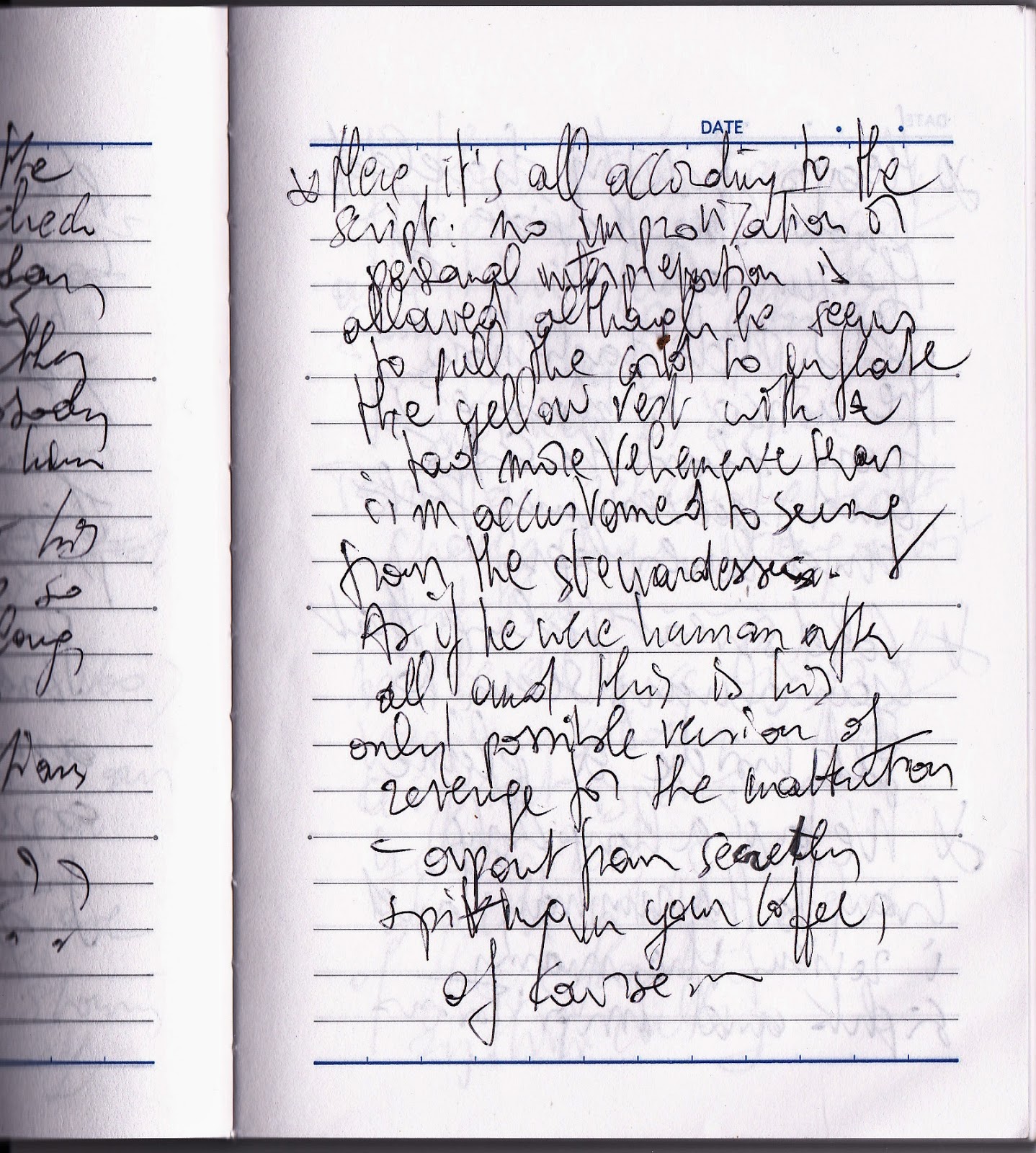 Today however, it’s a sturdy-looking Russian bear with sad, tired eyes, and nobody takes notice. I wonder how his day was. It’s evening now, maybe he’s had a long, rough day already. Now he’s going through the motions before an uninterested audience, like a musician who can’t find a way to connect to his listeners. Here too, as in classical music, he has to stick to the score. Not much improvisation or personal interpretation is allowed, although he seems to pull the cord of the yellow inflatable vest with a tad more vehemence than i’m accustomed to seeing from the stewardesses. As if he were human after all, and this is his only possible revenge for the passengers’ blatant lack of empathy – apart from spitting in their coffee, of course.