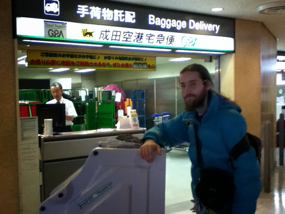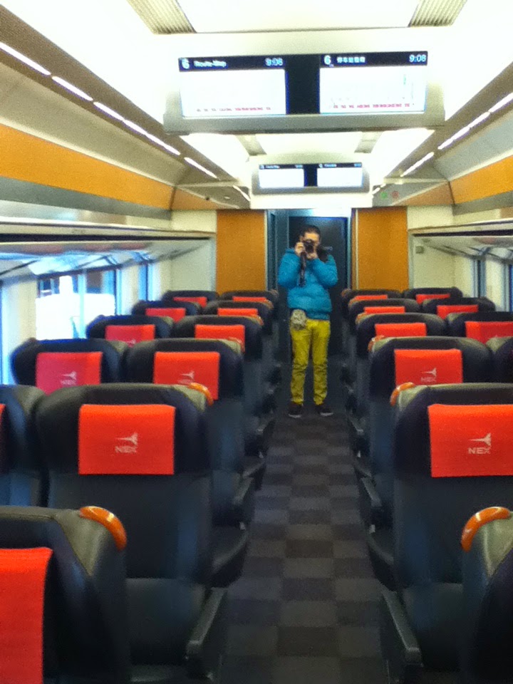 So once again we have to get up early because we’re taking the 7.15 from Minami-Urawa to Omiya, where we will board the Narita Express. But since today we’re travelling in the opposite direction from Tokyo, and only very few people commute from Minami-Urawa to Omiya, there is no problem whatsoever to get on the train with all our stuff. Nightmares for nothing.